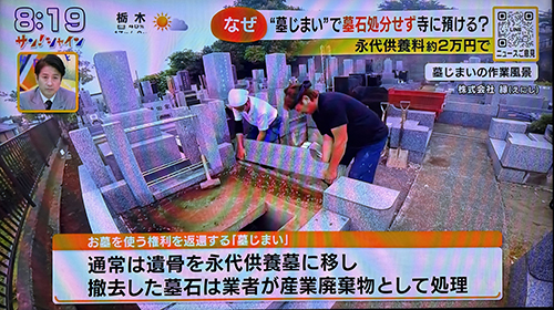 企業情報 お知らせ お知らせe-墓じまい からのお知らせ フジテレビ サン!シャインにて、墓じまいの様子が放送されました 2025年11月27日 2025/11/27オンエアのフジテレビ サン!シャインにて当社の ・墓じまいの様子 が放送されました。 ← 年末年始休業のご案内